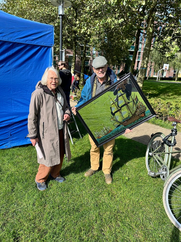 Een oude sigarenplank die in een kelder in de weg stond werd een aanwinst in een modern interieur, de nieuwe eigenaar van een decoratieve klok zou er zelf wel wijzers op maken. Onwillekeurig deed een tafereel denken aan “Tussen kunst en kitsch”. Goede gevers kwamen een spiegel brengen, beschilderd met schepen. De spiegel werd opgemerkt door vrijwilligers van Museum Amsterdam Noord, en jawel, volgende week zal de spiegel daar in de hal prijken!