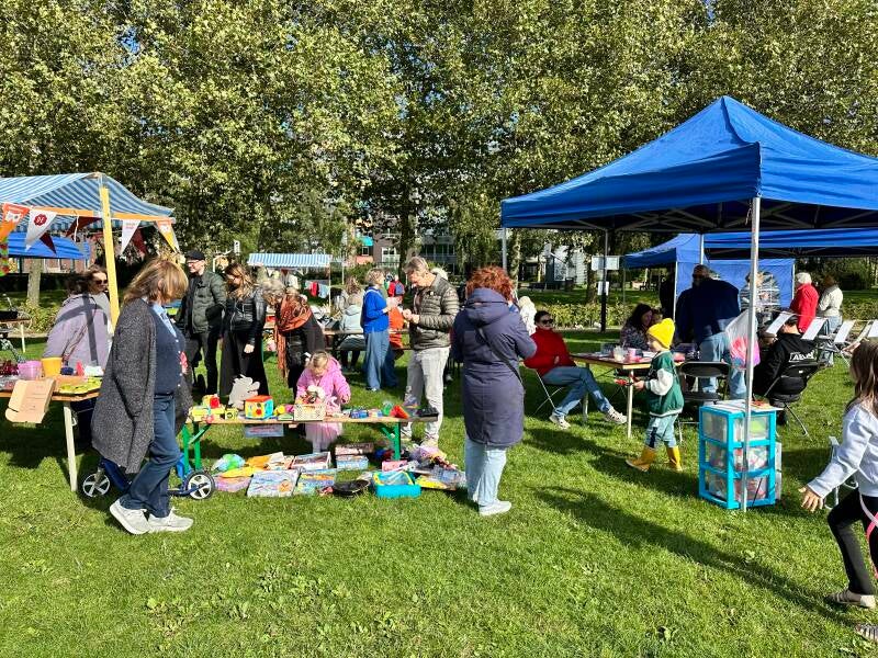 Op 29 september was het zo ver. Een ploeg van zo’n 20 mensen had in de Bogortuin een sfeervolle markt opgebouwd, een kring van kramen voor boeken, huisraad, klusspullen, een tafel om te knutselen voor kinderen, een reparatietafel en een baktent, met in het midden tafels waar gegeten en gedronken kon worden. Langs het wandelpad wapperde aan touwen tussen de bomen vrolijk de ingebrachte kleding.
