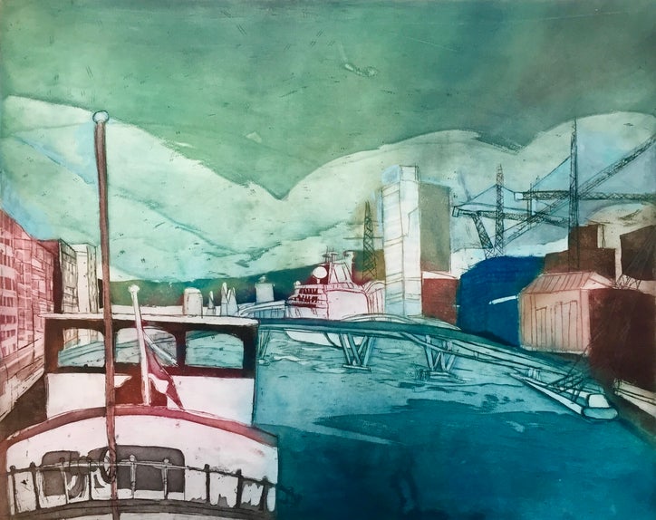 Uitzicht op 't IJ met pakhuis Wilhelmina ingepakt - ets 97x47 cm