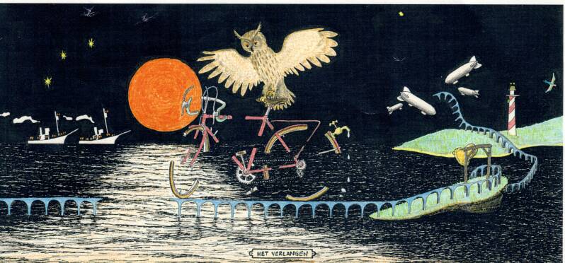 "Mijn werk gaat over dingen die gebeuren rond water, of op de reizen die ik gemaakt heb in China, Cabo-Verde, Noord- en Zuid-Amerika en uiteraard veel in Europa. Ook heb ik bootreizen gemaakt naar en in de Middellandse Zee en de Caraïben. De etsen, olieverfschilderijen en lino's zijn sfeerbeelden die laten zien hoe ik een gebeurtenis interpreteer. Verder bedenkt de kijker zelf maar wat er allemaal voorvalt."